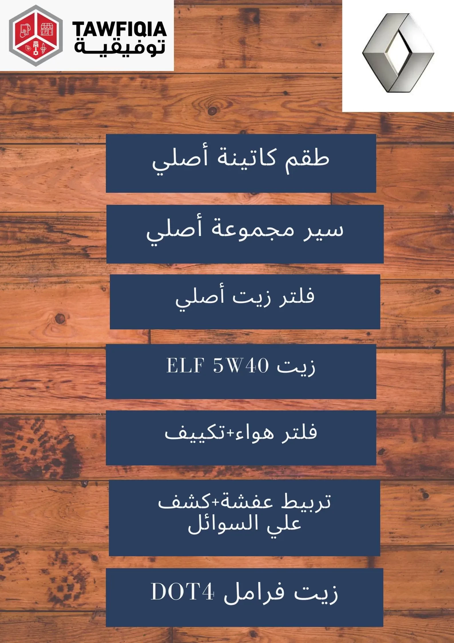 (طقم كتينة اصلى – سير مجموعة اصلى – فلتر هواء – فلتر زيت اصلى – فلتر تكيف – وردة طبة – زيت 10 الف elf مخصص رينو – مياه تبريد منول المانى –زيت باور منول المانى _ زيت باكمDot 4 – فلتر تكيف – فلتر طلمبة بنزين ) ( تربيط عفشة – كشف شامل – كشف جهاز