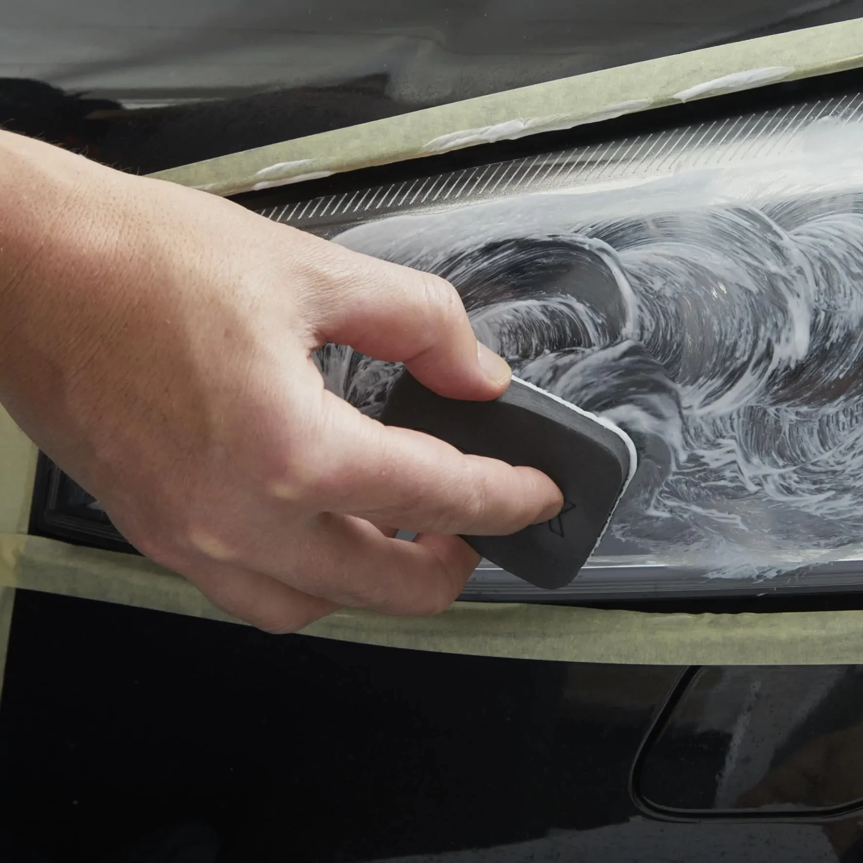 Set for a cost effective manual restoration of age related yellowed and Matt plastic headlights. In 2 easy steps yellowing, dullness and fine scratches are removed, prior to the long term sealing of the treated surfaces, which are then durably protected against renewed bleaching out. The application restores the headlight’s original clarity. Besides the beautiful appearance of the headlights and a value enhancement for the entire vehicle, the improved luminous efficiency ensures greater driving safety through the ability to see and be seen. For 2 applications on 2 headlights.