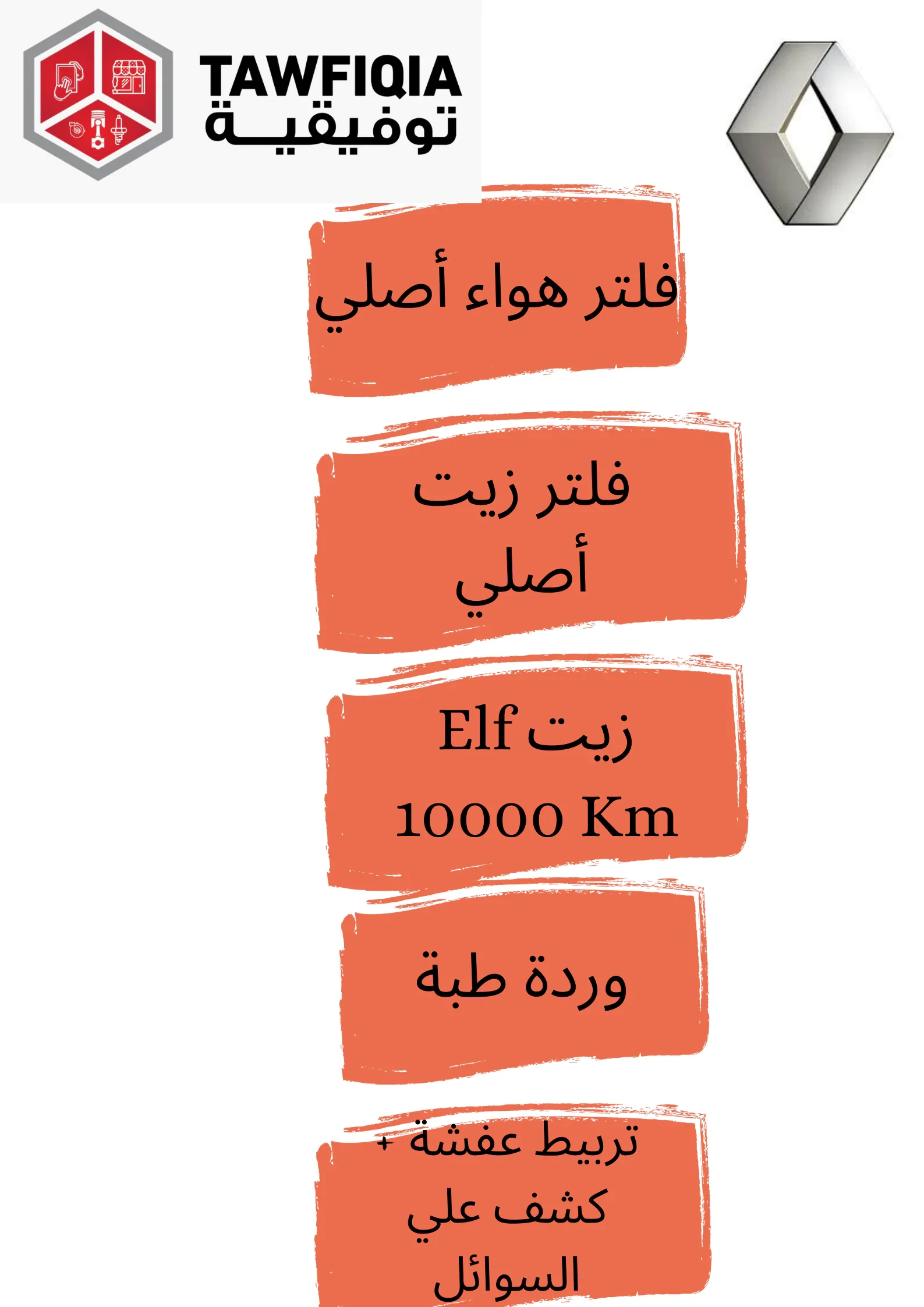 فلتر زيت أصلي - فلتر هواء اصلي - وردة طبة - زيت elf 10000 كم - تربيط عفشة - كشف علي السوائل - كشف كمبيوتر - غسيل محرك